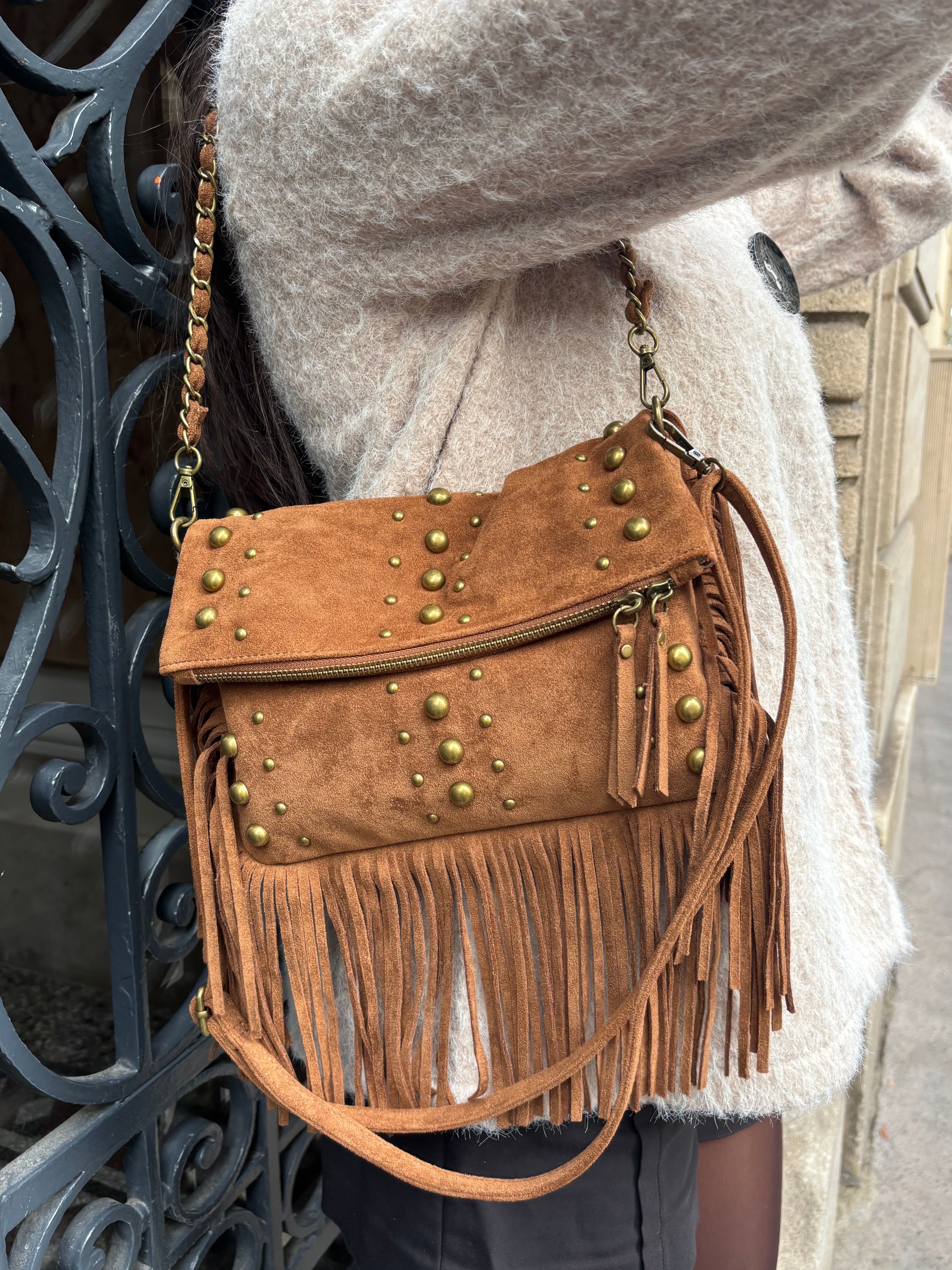 - Détails : franges délicates qui apportent légèreté et mouvement, clous métalliques espacés pour une touche rock et tendance. Fermeture zippée sécurisée et poche intérieure pour téléphone, cartes ou clés.