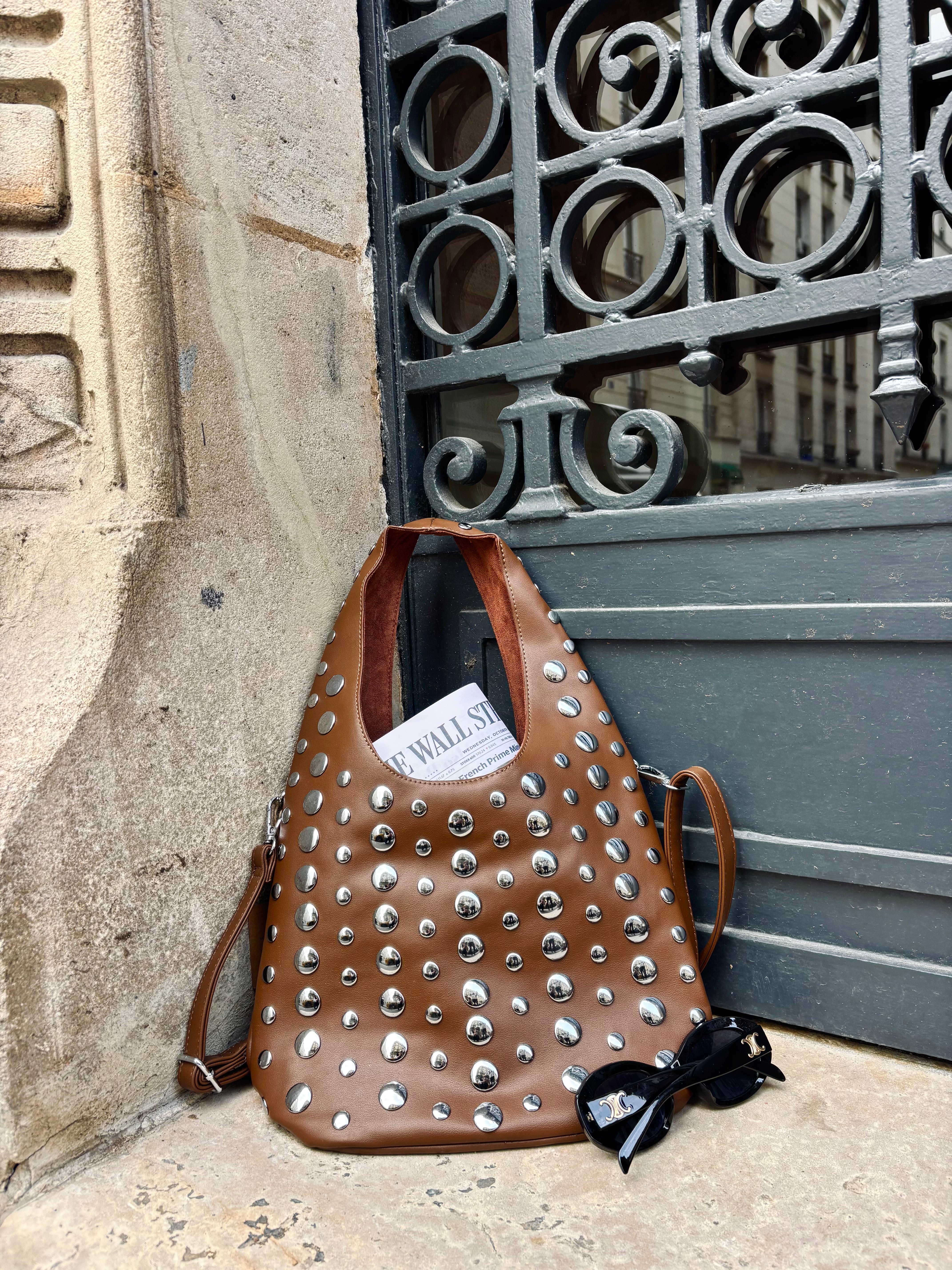 Porte-le à la main pour un effet minimaliste et élégant, ou sous le bras pour un style plus street-chic. Les clous argentés captent la lumière et apportent une touche rock sans en faire trop.